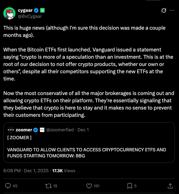 Crypto Twitter treated Vanguard’s reversal like the plot twist nobody saw coming but everyone secretly wanted.