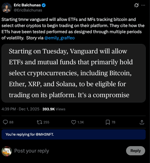 The vibe was basically: “Oh by the way, Vanguard will now let you buy Bitcoin ETFs tomorrow.”